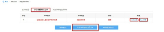 点击【下一步】,系统将自动进行指标校验,指标校验后,可以通过页签切换的方式,详细查看“即办资格”、“即办条件验证结果”、“其他条件验证结果”三大类指标中校验不通过的指标。