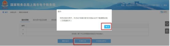 指标校验后,对于符合即办资格,且不存在未办结事项的纳税人,可点击【申请注销】,在注销套餐中直接将企业进行注销,并下载打印清税证明。