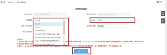 2.如注销原因为“依法合并”、“依法分立”,点击【下一步】后,将进入一般注销流程。