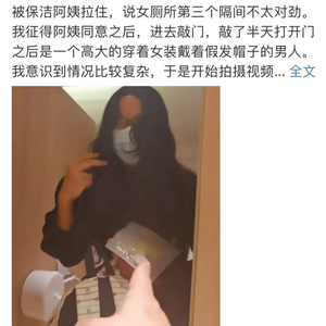据发布视频的大V介绍,11月15日晚,他在上海爱琴海购物公园上厕所出来之后,被保洁阿姨拉住,说女厕所第三个隔间不太对劲。其征得阿姨同意之后,进去敲门,打开门之后是一个高大的、穿着女装、戴着假发帽子的男人。