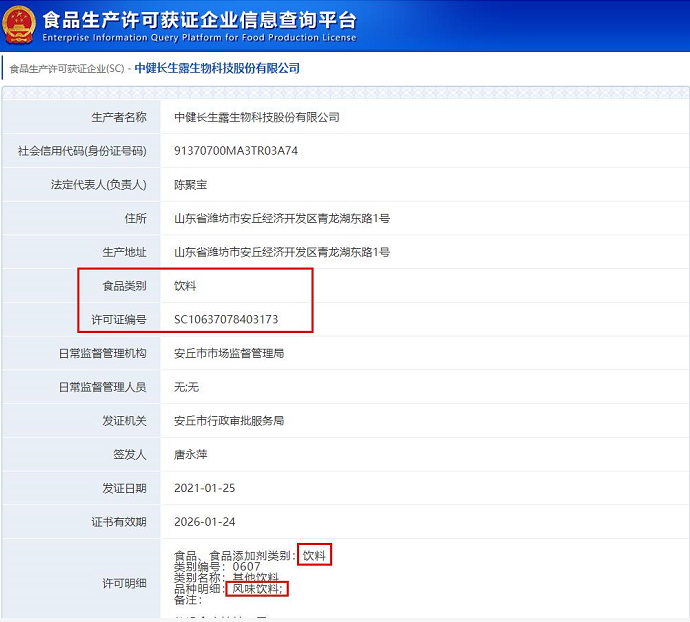 该产品的生产企业为中健长生露生物科技股份有限公司。国家企业信用信息公示系统显示,该公司成立于2020年8月14日,位于山东省潍坊市安丘经济开发区,股东为陈聚宝和山东长彤生物科技发展股份有限公司,主营饮料生产、酒制品生产、食品生产与经营等项目。“账号主体”为“中健长生露生物科技股份有限公司”、名为“中健长生露官媒”的微信公众号,简介显示“公司生产由我国抗衰老领域著名生物学家蒋松柏教授研发的‘长生露’复合饮品系列产品”。