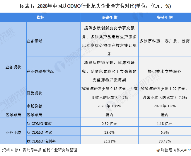 我国肽CDMO市场龙头企业分别为圣诺生物和安科生物,2020年,两家企业市场规模在肽CDMO行业市场占比达3.15%。两家龙头企业全方位对比如下: