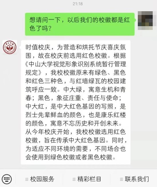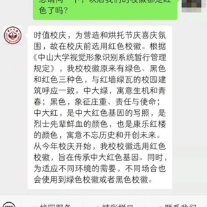 这名网友向中山大学官方微信公众号留言询问是否以后校徽都是红色版本,得到的回复称:“时值校庆,为营造和烘托节庆喜庆氛围,故在校庆前选用红色校徽。根据《中山大学视觉形象识别系统暂行管理规定》,我校校徽原来有绿色、黑色和红色三种色,与红墙绿瓦的校园建筑呼应一致……从今年校庆开始,我校校徽选用红色校徽,旨在传承中大红色基因。同时,为适应不同环境的需要,不同场合也会使用到绿色校徽或者黑色校徽。”