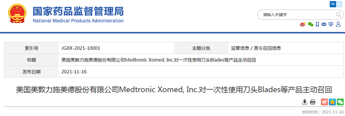 原标题:美国美敦力施美德股份有限公司Medtronic Xomed, Inc.对一次性使用刀头Blades等产品主动召回 来源:国家药监局网站