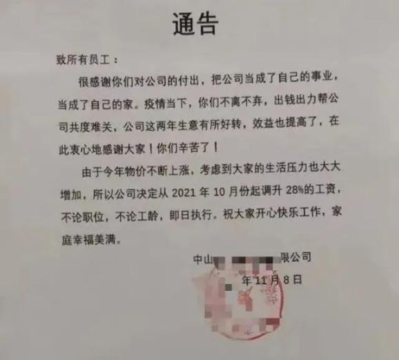 通告中称“由于今年物价上涨,考虑到大家的生活压力也大大增加,所以公司决定从2021年10月份起调升28%的工资,不论职位,不论工龄,即日执行”。