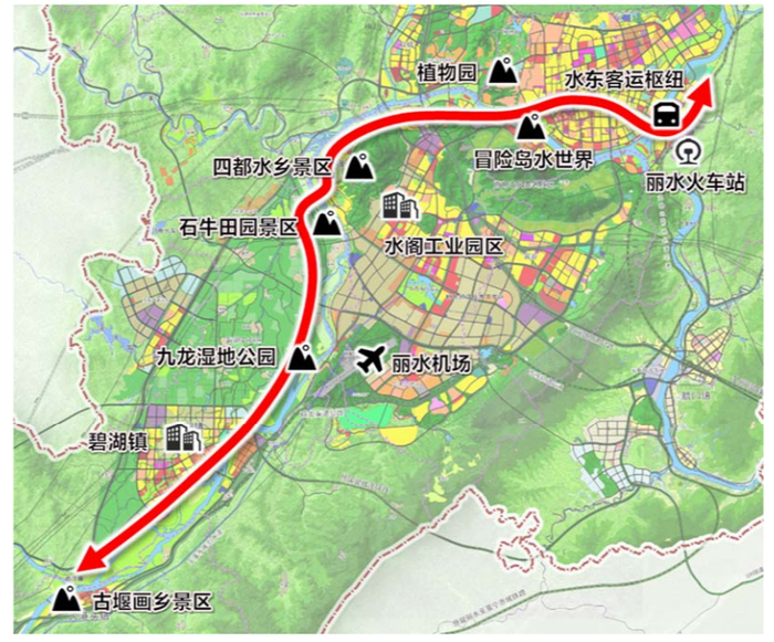 中闲观光轨道交通项目起于水东枢纽区块,途经丽水火车站、丽水机场,并串联丽水南北城区以及冒险岛水世界、白岩、四都、石牛、九龙湿地、古堰画乡等中闲区域的重点旅游度假风景区,线路全长约 35.02km,共设站18座,均为高架站,平均站间距为2.04km。项目建成后将成为沟通中心城区南北两城、串联丽水市重要交通枢纽与旅游景点的重要交通骨干线,具有缓解北城交通压力、带动南城开发以及促进丽水全域旅游的重要作用。