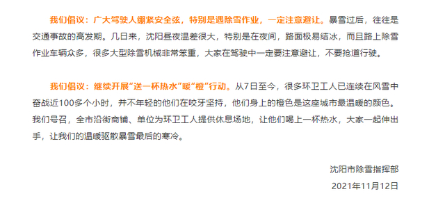 11月12日,沈阳除雪指挥部发布一份《倡议书》,倡议书中说:历史属于奋进者!在这场百年不遇的特大暴雪灾害中,广大市民以实际行动走上街头,在扫雪除冰中传递微笑、传递爱心、传播正能量。事实证明,这座温暖之城将融化任何风雪。