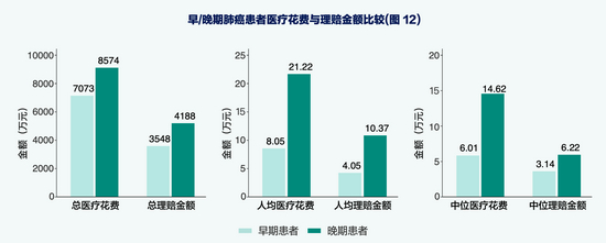 从治疗费用来看,商业健康险为肺癌患者报销比例达49.4%,起到了社保的补充作用。晚期患者人均总花费是早期患者的2.6倍,商业健康险通过推动对疾病早发现、早治疗,能够有效减少患者医疗费用。