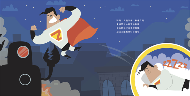 《超级英雄也要好好睡觉》是一本典型的“念经书”。每一页四句话,描述一位“了不起”的角色:打击坏蛋的超级英雄、救死扶伤的医生、遨游宇宙的宇航员、刻苦钻研的科学家、乘风破浪的船长……他们劳累了一天,都得去好好睡觉,所以顺其自然地,喜欢玩假装游戏,经常装扮成英雄、医生、船长的宝宝是不是也要去睡觉了呢?