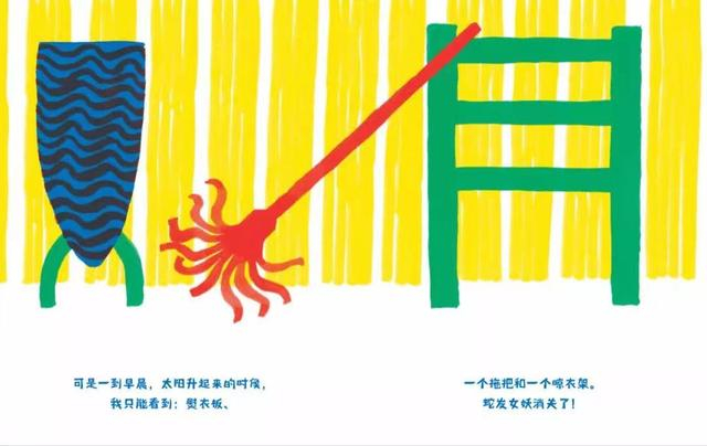 这本书里的怪物都很吓人,但翻到下一页就会发现它们全是日常物品的阴影组成的。怪物还有模有样地拥有名字:蛇发女妖、吸尘怪、沼泽怪……只要天亮后看到蛇发女妖就是外套、围巾和衣帽架的组合,套路就很明显了。读这本书可以把怪物变成猜迷,猜猜吸尘怪又是由什么组成的呢?猜着猜着,怪物就被分解得无影无踪,一点也不可怕了。