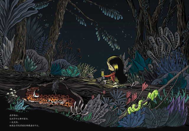 但黑夜并不总代表着“怪物”,也可以是喧嚣的世界安静后另一个世界的“热闹”。在《梦维拉》中,睡不着的小姑娘提着玻璃灯走进了梦维拉,寻找黑暗里藏着的秘密。她看见树洞里酣睡的小动物,贴着草地聆听来自地底的声音,窥探湖水,抬头看星星……想着想着她的睡意来袭,安然入睡了。