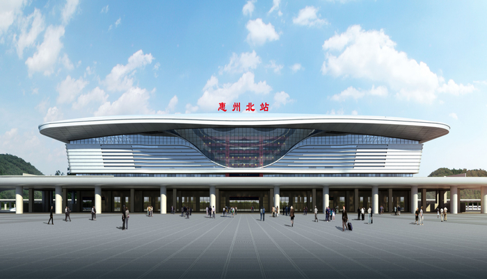惠州北站采罗浮山恢宏气势,提取惠州岭南名郡之文化特质,以舒展流畅的线条勾勒出新时代铁路客站速度高效的建筑形象,体现快速发展的惠民之州“绿色化现代山水城市”的城市地位。