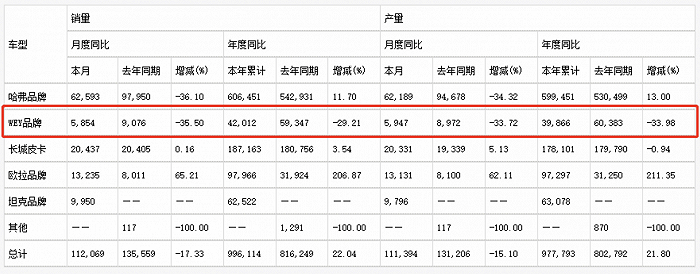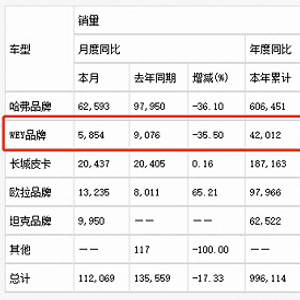 也就是说,上述几大品牌车型,只有WEY品牌系列在走下坡路。更具体点,WEY品牌系列已经连续7个月销量同比下滑。