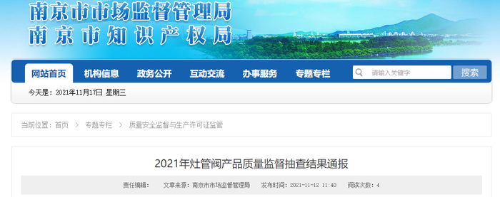 中国质量新闻网讯 近日,南京市市场监督管理局发布2021年灶管阀产品质量监督抽查结果通报。据通报,2021年度南京市市场监督管理局组织抽查家用燃气具配件产品75批次,不合格11批次,不合格项目为:结构、关闭压力、出口压力、螺纹。
