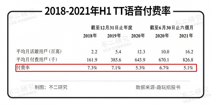 但在高速扩张的表象之下,付费率却连年下降。2018-2020年及2021年,TT语音的付费率分别为7.3%、7.1%和5.3%,已经处于下滑之中;2021年上半年更是创下新低,仅为5.1%,而2020年同期为6.7%。