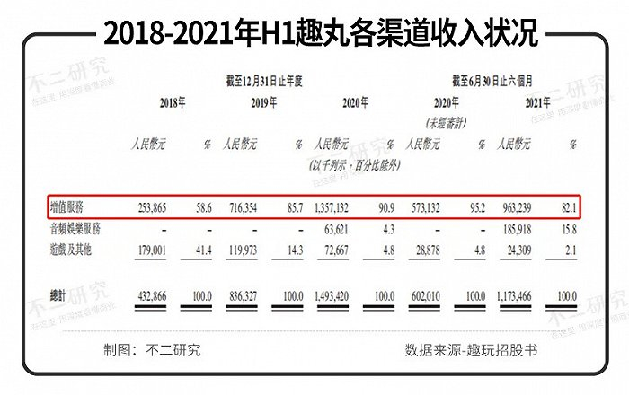 招股书显示,2018-2020年及2021年上半年,趣丸的增值服务收入分别为2.54亿元、7.16亿元、13.57亿元和9.63亿元,营收贡献分别为58.6%、85.7%、90.9%和82.1%,所占比重快速上升。
