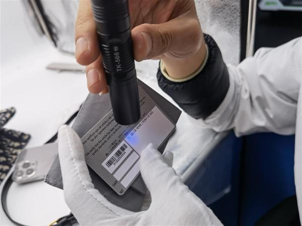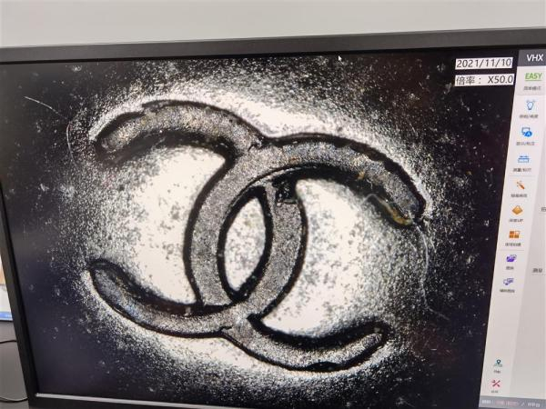 还有一款奢侈品的皮料、五金件等都做工精致,金属含量也与数据库比照一致。但鉴定师仍旧觉得和真品有差异,一时看不出哪里有问题。于是,几名鉴定师将中溯位于全国不同检测中心的同款产品汇总,展开“会诊”,终于发现问题所在:按照该品牌生产惯例,是从不同供应商处采购不同原料,品牌组装后才在五金件、内衬标签打上logo。由于是手工操作,每个logo有些许差异。但这些送检产品的logo雕刻完全一致,基本可判断为批量生产的结果,“换句话说,就是刻好了再安装到包上,而不是真品那种组装好再雕刻的效果。”