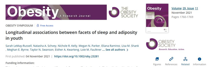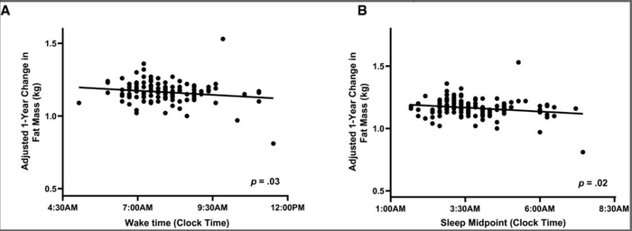 结果发现,醒来时间(P=0.03)和睡眠中点(P=0.02)与1年脂肪量呈负相关。该研究结果同时发表在肥胖杂志上。