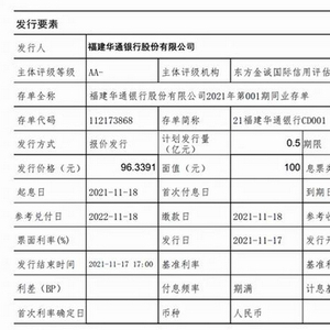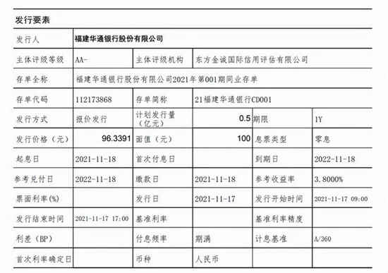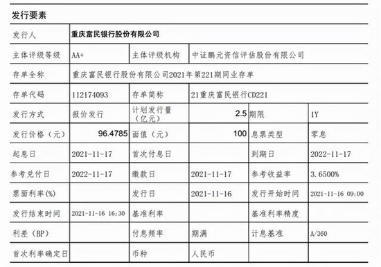 考虑到上述同业存单的发行期限的不同,记者对比了重庆富民银行2021年第221期同业存单和福建华通银行2021年度第001期同业存单的发行要素,两单的计划发行期限均为1年期(1Y),发行日分别为2021年11月16日和2021年11月17日,计划发行量分别为2.5亿元和0.5亿元,参考收益率分别为3.65%和3.8%。二者的主体信用评级等级分别为AA+和AA-。
