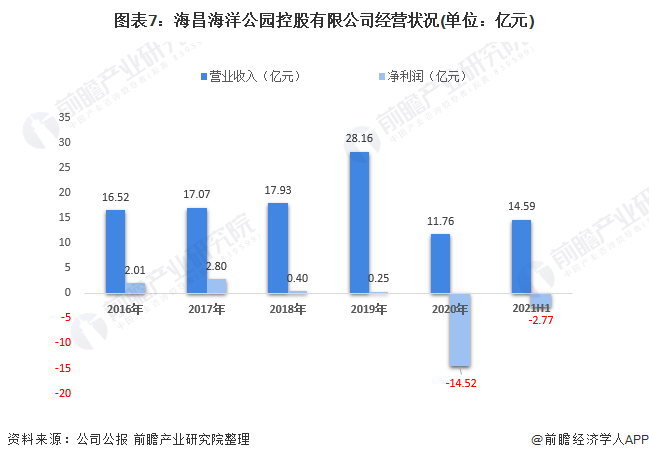 根据公司财报显示,2016-2019年海昌海洋公园控股有限公司营业收入逐年攀升,2019年创营收新高,达28.16亿元,主要系国内经济提升以及消费结构的转型。2020年收入下降至11.76亿元,主要系受疫情影响。但2016-2020年整体净利润呈下降态势,2020年净利润达14.52亿元,高于总营业收入2.76亿元,根据2021年半年度报告,海昌海洋公园净利润亏损2.77亿元,可以看出业绩仍在持续亏损。