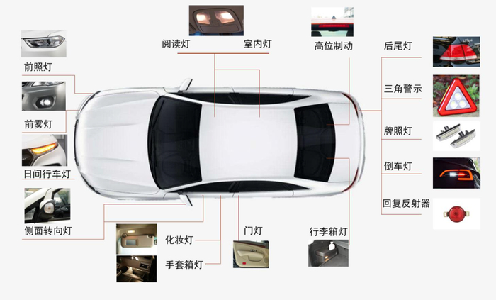 汽车车灯大体上分为头灯、后组合灯、雾灯以及内饰灯。头灯模块主要涵盖远近光,日间行车,位置(示廓),转向等,功能上主要以照亮道路、信号提示为主。同时在汽车外观设计中扮演着汽车之眼的作用,各主机厂根据自身品牌需求或各车型不同的市场定位,在造型上通常选择家族脸谱式或车型特有式大灯设计。后组合灯模块主要包括位置(示廓)、制动(刹车)、转向、后雾灯(集成式),功能上主要以位置警示、动作提示为主。雾灯包括前雾灯和后雾灯,通过增加雾雨雪天气中的光线透过率及光通量起到近场辅助照明以及位置警示的作用。内饰灯包括氛围灯、阅读灯、车顶灯、后备箱灯及迎宾地毯灯等,在满足传统阅读和照明需求的同时,还可以提供交互感知体验等动态效果,丰富驾乘体验。