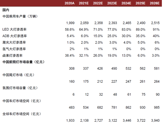 受技术升级驱动,全球市场有望扩容至四千亿。技术升级持续驱动汽车照明产品升级,带动功能化车灯逐步转向数字化视觉系统。需求端消费者对于智能化体验的增量需求促使车企确定智能车灯战略。供需逻辑顺畅之下,随着晶圆级封装技术促使上游LED芯片成本不断下降,ADAS摄像头装配率提升带来的采购边际成本下降,我们认为,自适应大灯ADB将成为市场主要增量来源:我们预计ADB渗透率有望于2023年突破20%,2025年突破35%,中期带动国内头灯市场价值总量扩容100亿元以上,并带动产业持续升级,全球车灯市场价值总量有望在2026年扩容至4000亿元。