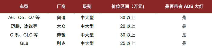 第一阶段:2018年之前,ADB主要搭载在豪华车型,包括奥迪A8以及奔驰S级。在和激光大灯的竞赛中,ADB凭借其智能化优势以及整体成本优势速度逐渐成为各主机厂进一步发展的方向。