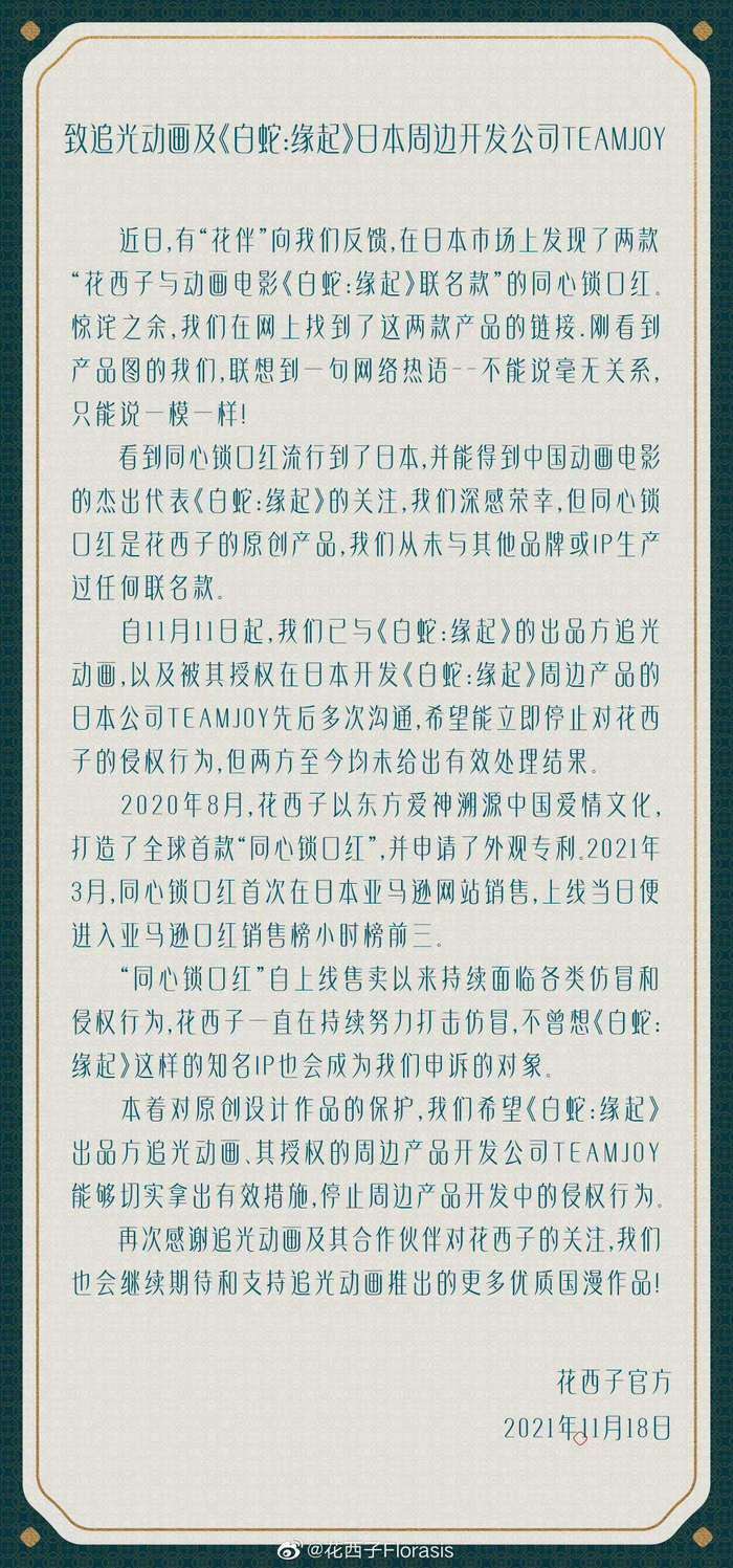 花西子称,自11月11日起,已与《白蛇:缘起》的出品方追光动画以及TeamJoy先后多次沟通,希望能立即停止对花西子的侵权行为。花西子方面表示,希望对方尊重原创,立即停止对花西子的侵权行为。