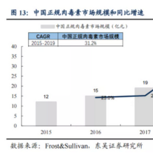 根据Frost&Sullivan的研究,2019年中国正规肉毒素市场规模已达36亿元,2015~2019年4年年均增长31.2%,2020-2024年正规肉毒素市场规模将保持年均17.5%的增长,到2024年,这个市场规模将增至80亿元。