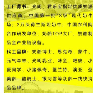 2021年10月9日,君君乳酪在其微信公号“芝仕坊”上发布秋糖展会预告文章,打出“奶酪棒 中国奶酪源头工厂”的宣传字样。根据文中介绍,君君乳酪是“奶酪TOP大厂”,拥有奶酪制品全产业链设备,代工品牌有奶酪博士、思克奇、元气森林、味全、吧彼、小爱同学、小猪佩奇、堡兰特、澳亚、圣美多、酪骑士等。该公号历史文章显示,君君乳酪累计为全国超过60多个品牌提供奶酪代工业务,截至今年7月代工的奶酪棒品牌有20多个。