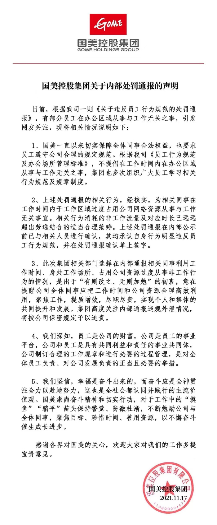 国美控股表示,上述处罚通报的相关行为,经核实,为相关同事在工作时间内于工作区域过度占用公司网络资源从事与工作无关事宜。相关行为消耗的非工作流量及对应时长已远远超出劳逸结合的适当合理范畴。上述处罚通报在内部公示前已与相关人员进行确认,其均承认自身行为明显违反员工行为规范,并在处罚通报确认单上签字。