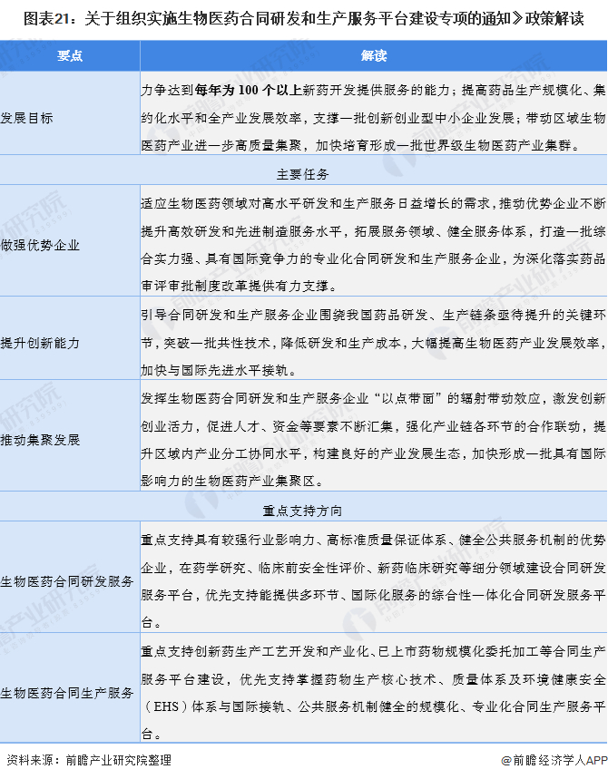 在2018年5月31日,国家发展改革委办公厅、工业和信息化部办公厅、国家卫生健康委员会办公厅、国家药品监督管理局办公室联合发布了《关于组织实施生物医药合同研发和生产服务平台建设专项的通知》指出将着力推进供给侧结构性改革,积极推动药品上市许可持有人制度全面实施,重点支持一批高水平、国际化的综合性生物医药合同研发和生产服务平台建设,着力提升生物医药研发和生产服务能力,促进生物产业倍增发展,培育生物经济新业态新模式。