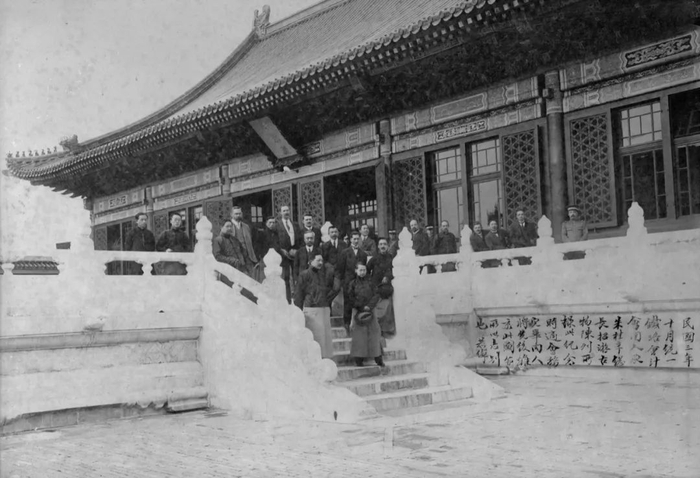 1914年10月1日 铁路会计会同人参观古物陈列所后在武英殿前合影(前排持帽者为叶恭绰)