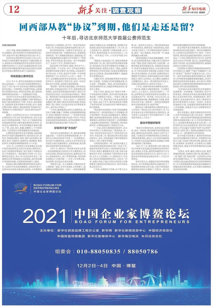 2021年,北京师范大学在暑期社会实践中组织在校师范生寻访已毕业的公费师范生,但由于疫情防控等原因,原计划线下开展的寻访工作难度加大。“我们最终寻访到101位公费师范生校友,其中69名是首届毕业生。”珠海校区乐育书院副院长闫虹庚说,他们坚定履行对国家的承诺,扎根西部的故事令人感动。