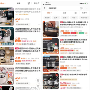中国网财经记者在多家电商平台搜索“低糖电饭煲”关键词,出现了上百种相关产品,包括苏泊尔低糖电饭煲、德国索韦尔低糖电饭煲、千寿低糖电饭煲、美的低糖电饭煲、臻米低糖电饭煲、何大厨低糖煲等,价格在200-2000多元之间不等。