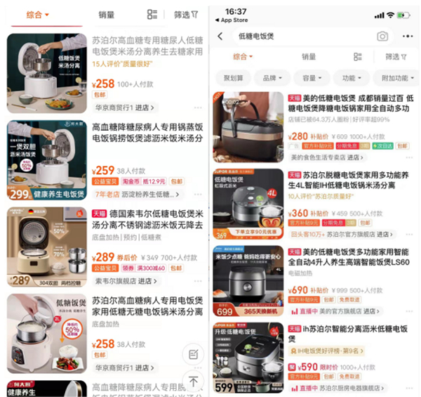 其中,美的、苏泊尔等厂家的产品标题出现了“降糖”、“高血糖专用”、“糖尿病专用”等“引流”关键词,此外,大部分产品在产品介绍页面都有“低糖不降营养”、“分离淀粉的同时,还能过滤大米中的添加剂”、“饱腹又低卡的健康饭,减糖不减口感”等宣传语。