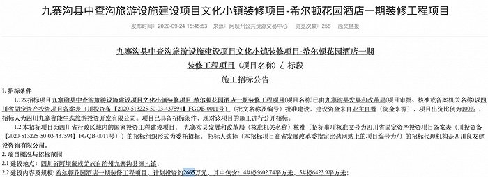 2020年9月,四川九寨鲁能生态旅游投资开发有限公司发布希尔顿花园酒店一期装修工程施工项目招标公告,计划投资额约2665万元;2020年12月,公司发布希尔顿花园酒店二期装修工程评标结果公示中标候选人及排序信息,第一名为深圳市科源建设集团股份有限公司,经评审的投标报价为15738055.38万元。信息显示,九寨沟希尔顿花园酒店拥有拥有315间客房和套房,2021年4月,九寨鲁能希尔顿花园酒店正式开业。
