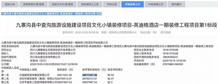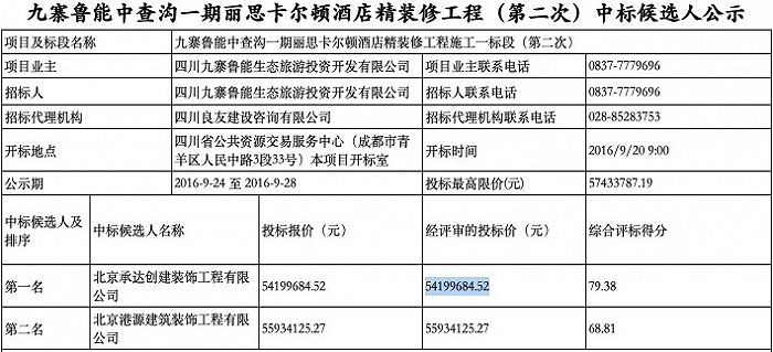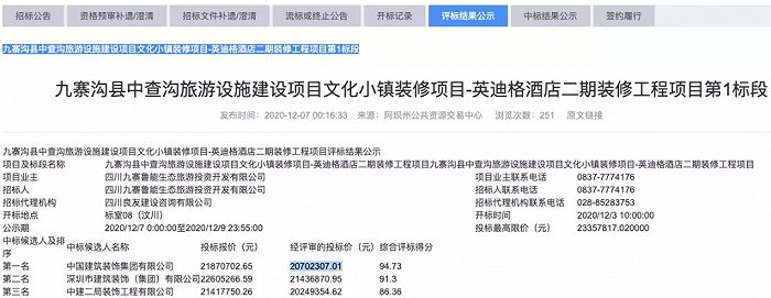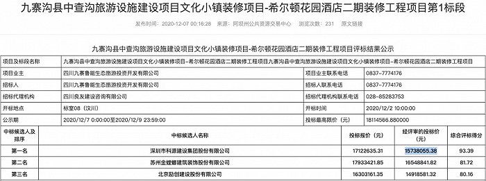 也是在2020年12月,四川九寨鲁能生态旅游投资开发有限公司发布了九寨鲁能文化小镇装修项目—商业区域装修工程项目评标结果公示,中标候选人第一名为深圳市科源建设集团股份有限公司,经评审的投标价为4918601.06万元。
