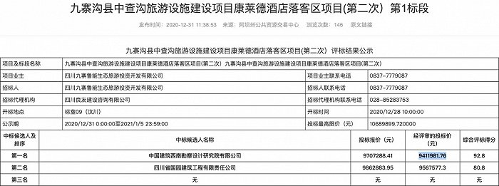 2020年12月,四川九寨鲁能生态旅游投资开发有限公司发布了项目内康莱德酒店落客区项目(第二次)评标结果公示,中标候选人第一名为中国建筑西南勘察设计研究院有限公司,经评审的投标价为9411981.76万元,九寨沟康莱德酒店共有161间豪华客房、套房和独立别墅。