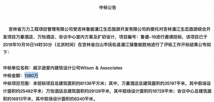 另据了解,长白山鲁能胜地早前和万豪万怡酒店、希尔顿酒店签署过战略合作协议,2018年10月,长白山鲁能胜地项目公司还发布过会议中心室内方案及扩初设计中标公告,但不知为何至今再无下文。
