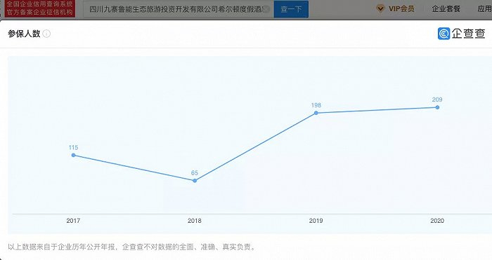企查查显示,在九寨沟地震后的次年,项目内希尔顿度假酒店的参保人数由2017年的115人减至65人,但与九寨沟景区重新开放和黄龙机场复航同步,九寨沟希尔顿度假酒店于2019年9月重新开业,成为九寨沟首家震后重启的国际联号,其酒店参保人数在当年增至198人,并于2020年增209人。