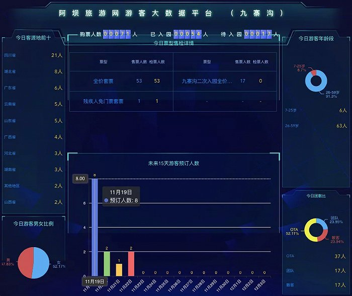 受此影响,九寨沟景区客流量坠至冰点。以本篇发稿时间为例,闻旅查询阿坝旅游网游客大数据平台(九寨沟)的数据看到,11月18日截至下午3点,九寨沟景区当日购票人数为71人,已入园人次为54人,次日(11月19日)预定人数更是仅为个位数。对比2021年国庆假期,九寨沟景区才迎来震后首个旅游高峰,单日最大承载量4.1万人次,此轮疫情反弹给九寨沟旅游业带来的冲击力之大,由此可见一斑。