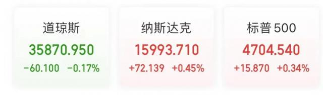 11月18日,美股三大指数仅道指下跌,跌幅0.17%,报35870.95点,连跌两日,创10月29日以来收盘新低。标普上涨0.34%,报4704.54点。纳指上涨0.45%,报15993.71点。