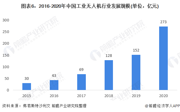 2015-2019年,中国工业无人机行业高速发展,五年年均复合增长率约为50%。根据弗若斯特沙利文数据,2019年,我国工业无人机市场规模约达152亿元,2020年,我国工业无人机市场规模约达273亿元。