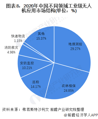 从结构上看,2020年中国工业无人机主要应用领域里,地理测绘占比最大,约29.27%,其次为农林植保、巡检、安防监控及消防救灾,占比分别为24.85%、14.17%、10.21%及4.98%。