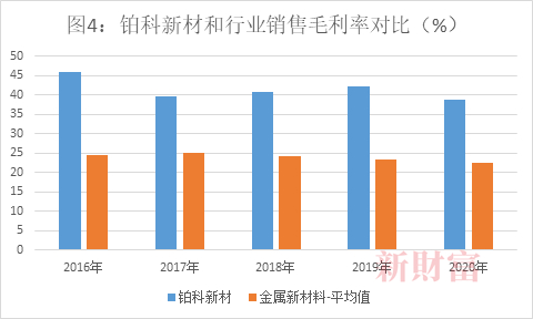 数据显示,2016至2020年,铂科新材的销售毛利率基本在40%上下震荡,在行业中领先。