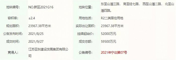 在今年9月26日土拍中,NO.新区2021G16地块,亚东以总价5.95亿元拿下新区G16地块,楼面地价10344元/㎡,未来毛坯销售限价19520元/㎡。