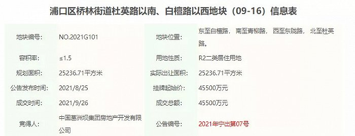 在今年9月26日土拍中,NO.2021G101地块(杜英路以南、白檀路以西地块)经过1轮竞拍,被葛洲坝拿下,成交总价45500万,楼面价12020元/平,最高毛坯销售限价24500元/㎡。