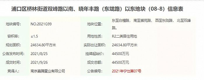 NO.2021G99地块(双峰路以南、晓年丰路(东垅路)以东地块)经过1轮竞拍,被龙湖底价拿下,成交总价44500万,楼面价12043元/平,最高毛坯销售限价24500元/㎡。