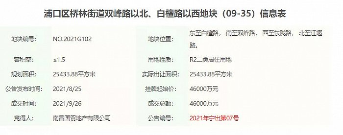 NO.2021G102地块(双峰路以北、白檀路以西地块)经过1轮竞拍,被厦门国贸底价拿下,成交总价46000万,楼面价12057元/平,最高毛坯销售限价24500元/㎡。
